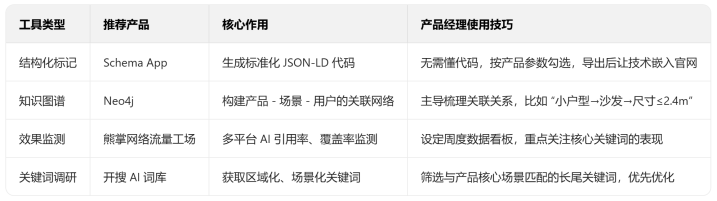 工具选型:产品经理主导选择适合的工具,无需依赖技术团队从零开发。比如用SchemaApp生成JSON-LD代码,用Neo4j构建产品知识图谱,用熊掌网络流量工场监测效果。